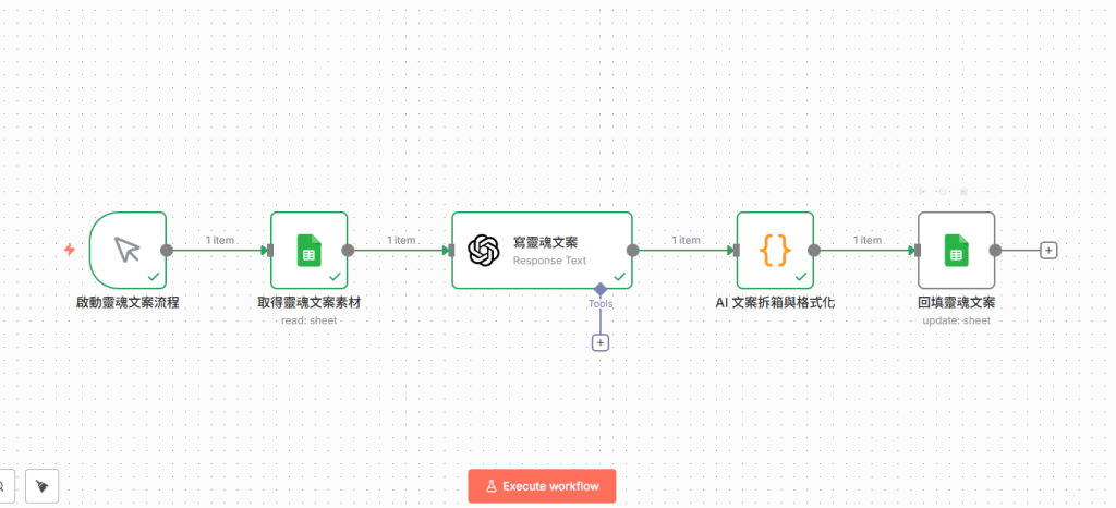 手動觸發 → 讀取素材 → AI 生成文案 → 格式化處理 → 回填試算表